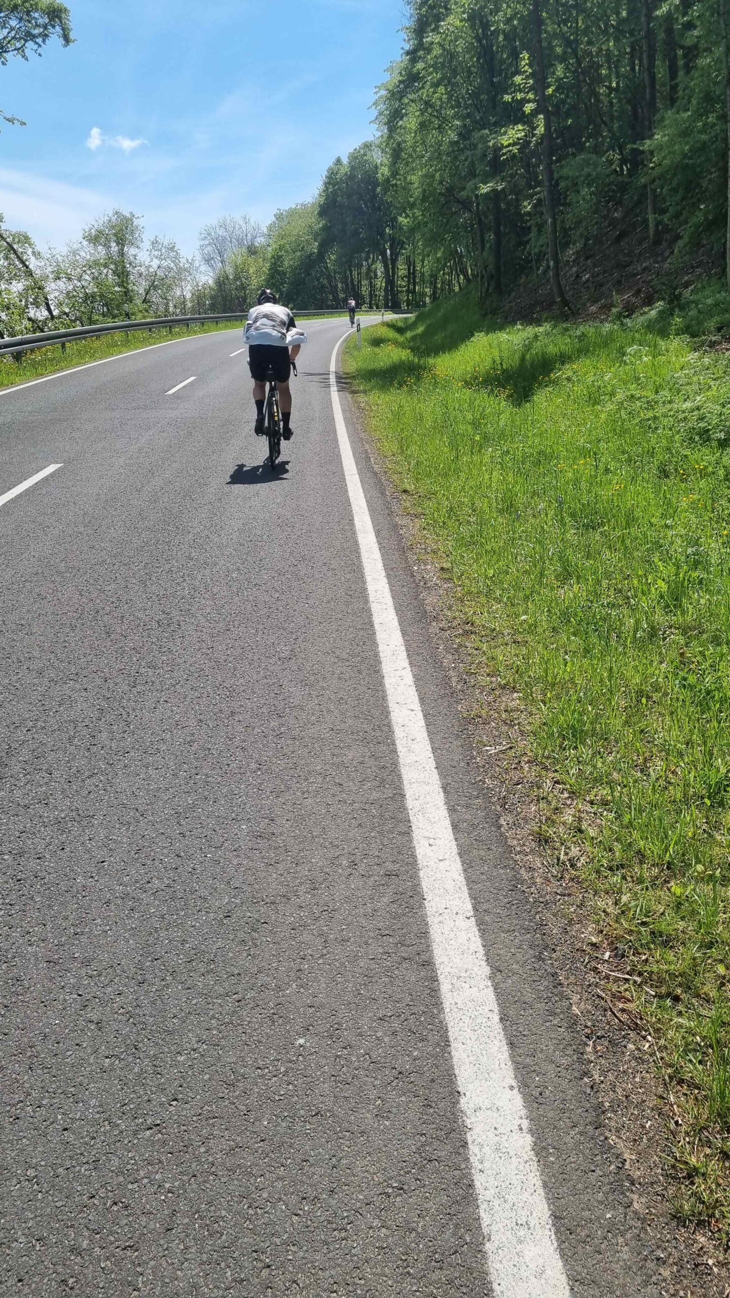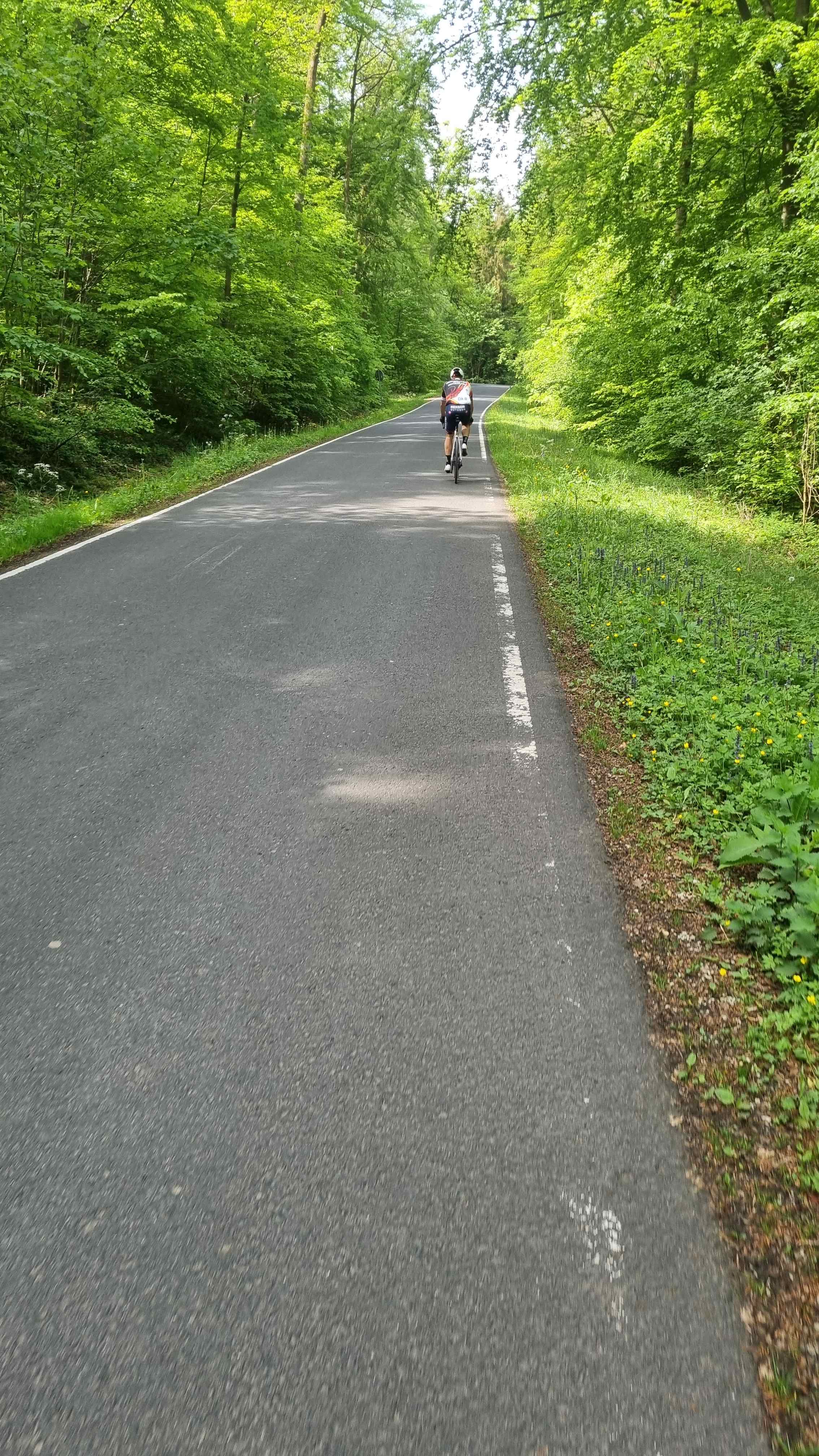 Heute sollte der Höhepunkt das Kloster Kreuzberg sein. Im letzten Jahr waren Fayek und ich nur bis zum Busparkplatz gefahren, heute sollte es bis ganz nach oben gehen. Doch erst einmal ging es über die Steilwand Richtung Poppenhausen. Den Anstieg meisterten wir alle bravourös und so ging es gemeinsam in die tolle Abfahrt. Ab Bischofsheim ging es dann in den Anstieg zum Kloster Kreuzberg. Den  ersten Teil hatte ich gar nicht so steil in Erinnerung und schnell riss unsere Gruppe auseinander.