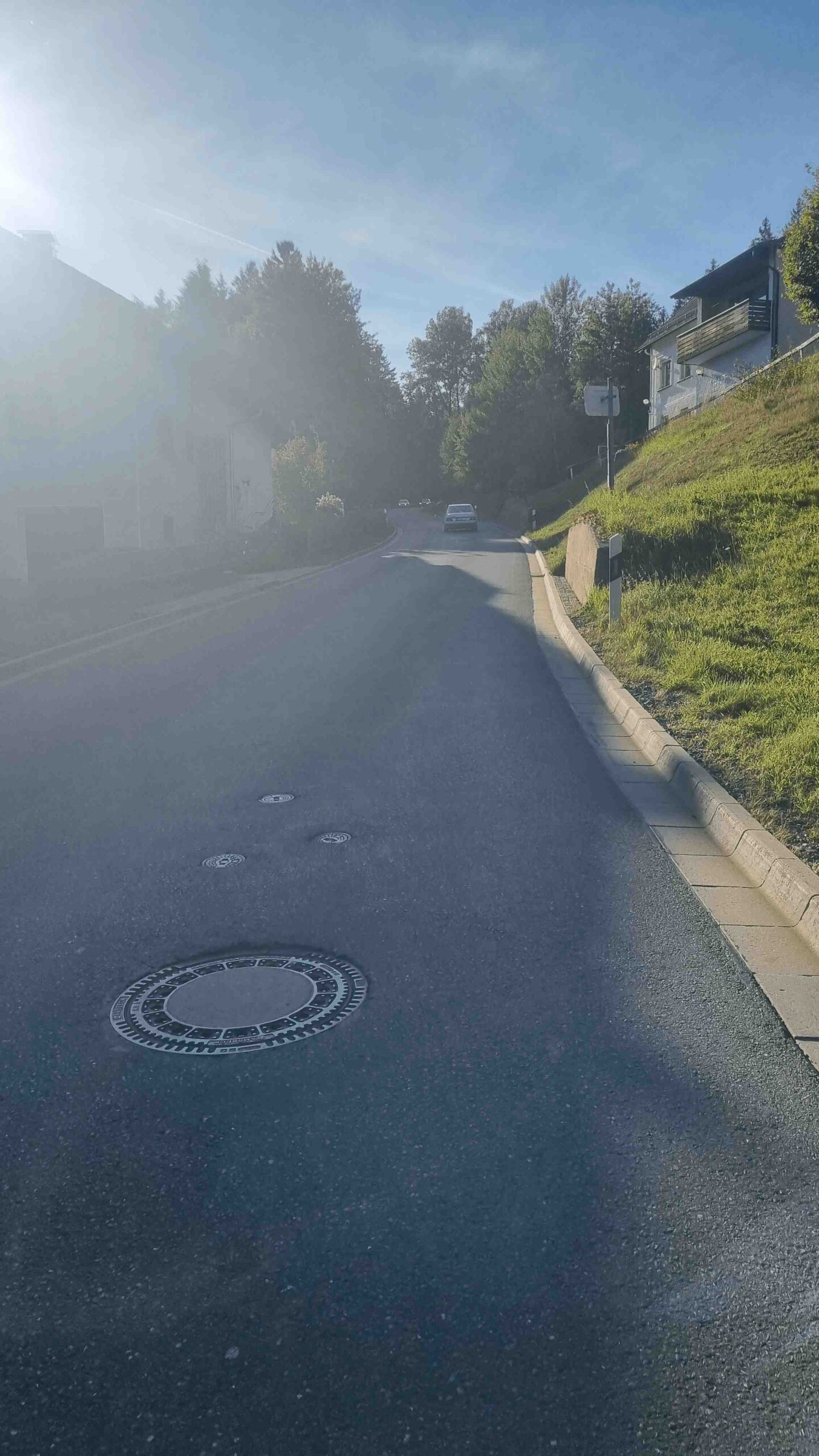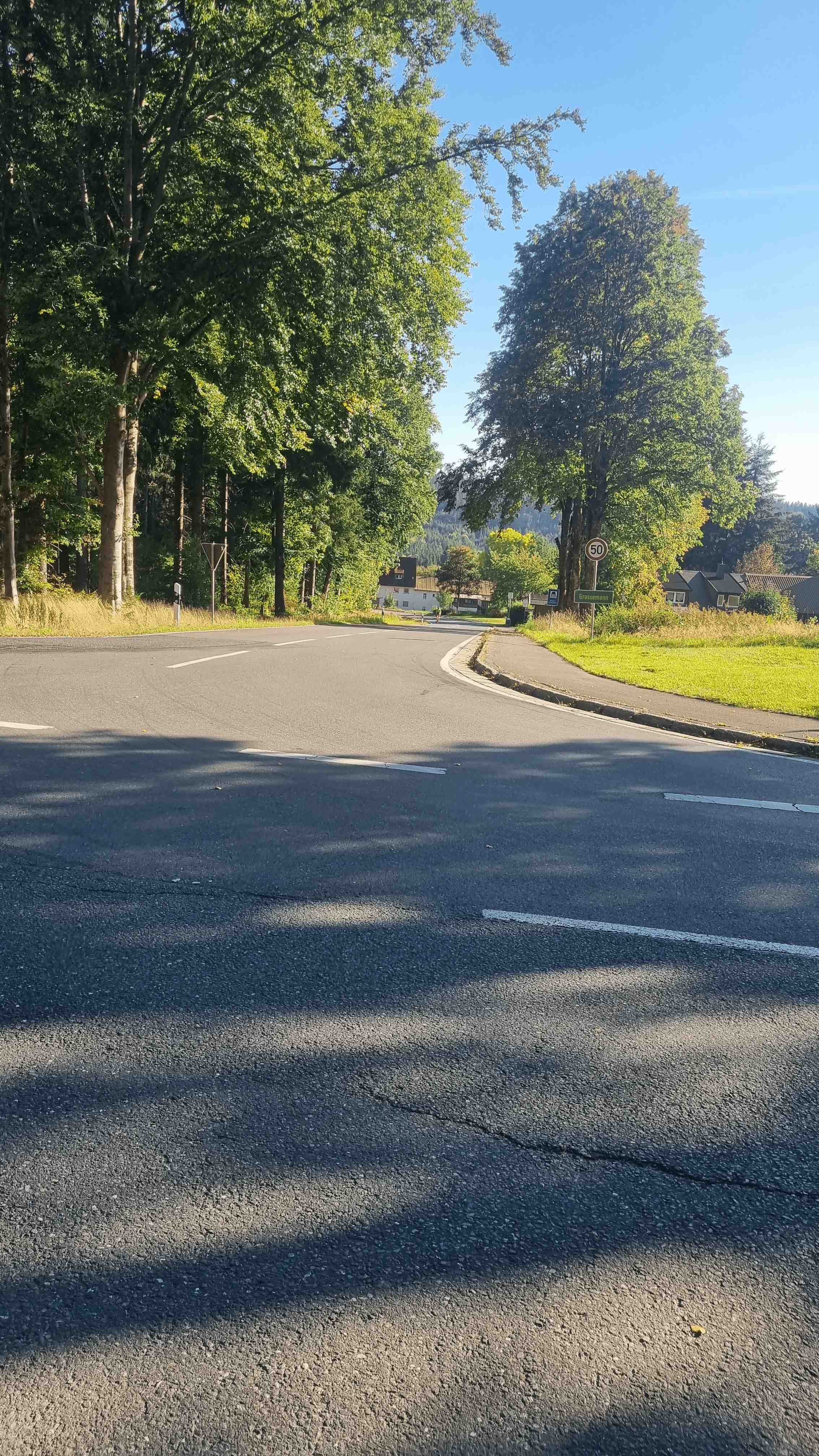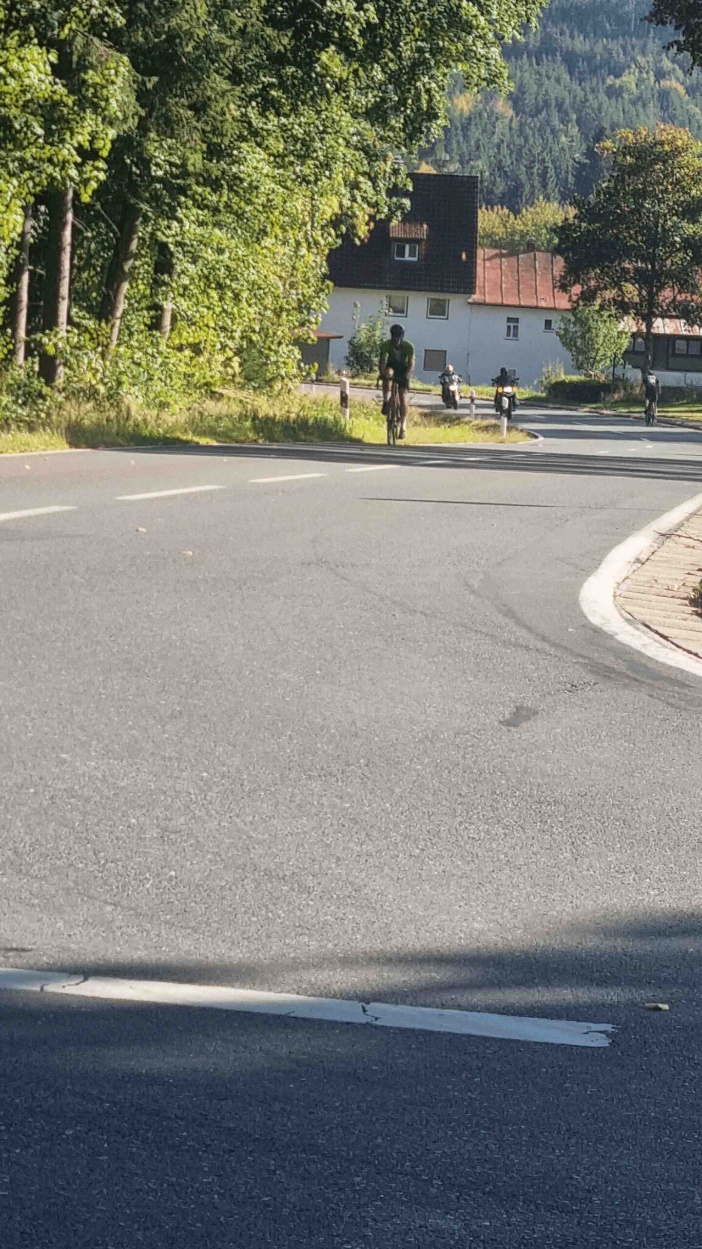 Fayek entschied sich dann doch noch mitzufahren und so waren wir zu viert. Da keiner von uns einen Radträger für vier Räder hatte und mein Auto an dem Wochenende nicht zur Verfügung stand hieß es mit zwei Autos zu fahren. Skobi und Fayek fuhren in einem und Stefan und ich m anderen, zumal Stefan erst etwas später von der Arbeit loskam. Auf der Fahrt hatten wir bei Leipzig mal wieder eine Vollsperrung und so kurvten wir um die Stadt mit vielen anderen Autos herum und kamen mit ca. 1 Stunde Verspätung an unserem Startort an. Trotz allem waren wir etwas schneller als Fayek und Skobi gewesen. Die beiden Zimmer, die ich gebucht hatte, erwiesen sich als sehr geräumig und wir konnten unsere Räder problemlos im Zimmer sicher abstellen. Wir wanderten noch nach Münchberg rein und suchten eine Lokalität, bei der wir noch etwas Essen konnten. Eine kleine Pizzeria war offen und gar nicht so schlecht. Im Nachgang versorgten wir uns noch mit einem Sixpack und einer Tüte Chips an der Tanke, dann ging es zurück zum Hotel. Dieses war an eine Konditorei angeschlossen und wir bekamen am nächsten Morgen ein großartiges Frühstück. Schließlich sollte es losgehen. Die Radcomputer waren an und wir klickten ein, doch schon nach wenigen hundert Metern hielt Stefan an, weil er nicht schalten konnte. Wir untersuchten die Schaltung, doch alles sah gut aus. Einzige Vermutung war, dass die Batterie sich über Nacht entladen hatte. So ging es zurück zu den Autos. Glücklicherweise hatte Stefan sein Ladekabel für die DI2 dabei und Skobi hatte eine Powerbank im Auto, an den wir das Kabel anschließen konnten. Dann hieß es warten. Nach rund 45 min hatte die Batterie wieder einen Ladestand von 50 % und alles funktionierte. Stefan war doch recht genervt gewesen, zumal er die Batterie erst vor ein paar Tagen aufgeladen hatte. Die Vermutung war, dass einer der Bremsschalter während der Hinfahrt so gelegen hatte, dass er ununterbrochen ein Signal geschickt hatte und dieses die Batterie entleerte. Doch dann ging es endlich los. Das Wetter war uns auch sehr gewogen, die Sonne schien und es waren angenehme Temperaturen.
