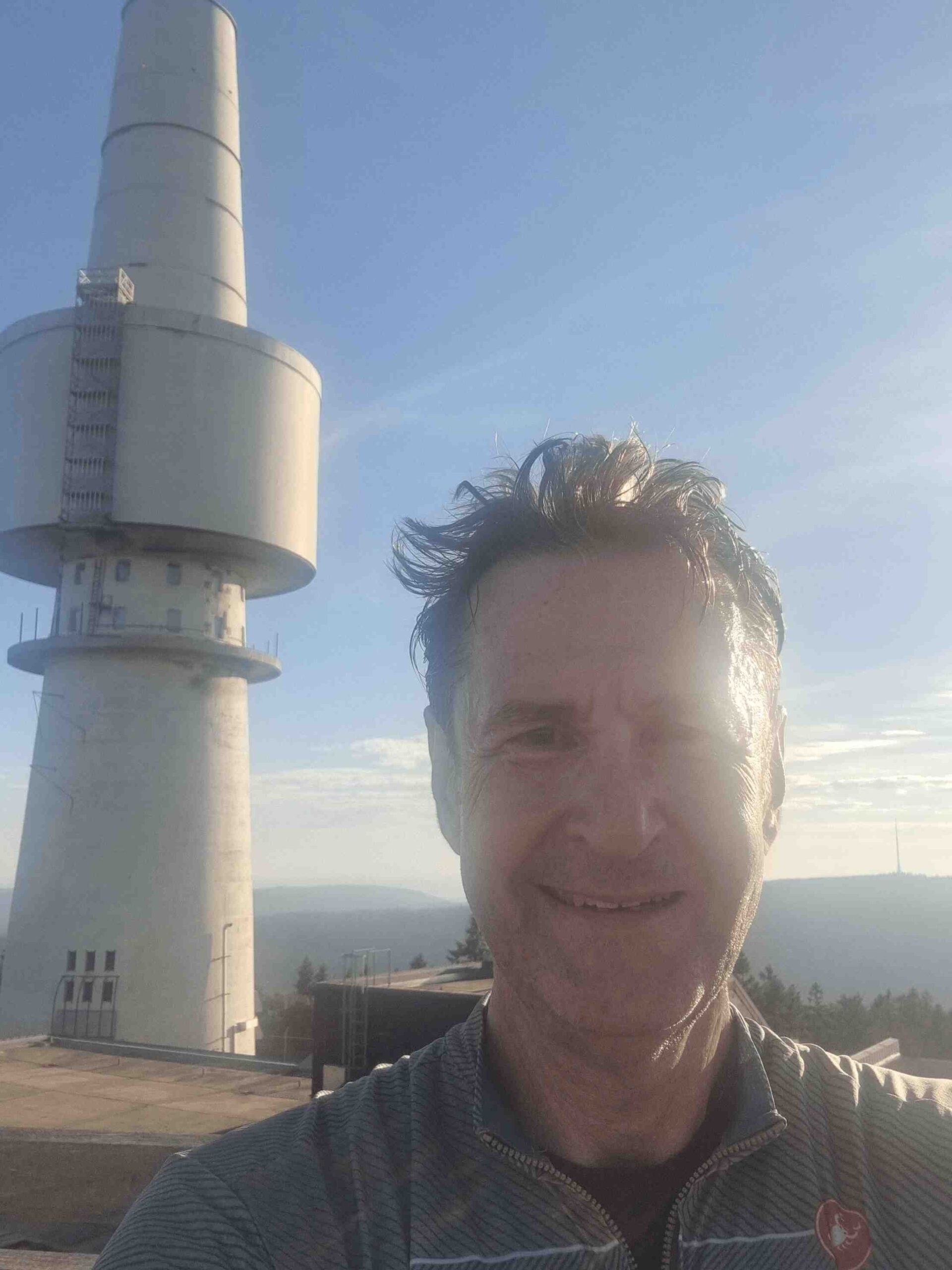 Bevor es in Richtung Schneeberg ging, machten wir nochmal einen Stopp an einem kleinen Supermarkt, der etwas versteckt lag. Stefan fehlte komplett die Motivation und er wollte diesen Anstieg nicht mitnehmen und auf uns unten warten. So trennten wir uns am vermeintlichen Abzweig und fuhren erstmal zu dritt weiter. Ich setzte mich aber sehr schnell von den beiden ab, da ich an diesem Berg doch nochmal meine Leistung testen wollte. Das erste Stück war steiler als erwartet, dann ging es in einer Kurve auf die eigentliche Auffahrt. Die Straße selbst war sehr gut und dazu für Autofahrer gesperrt, sodass ich ganz allein auf weiter Flur den Berg hoch eilte. Oben gab es einen Aussichtstur den ich erkletterte und einen großartigen Blick über das Fichtelgebirge hatte. Etwas später kamen Fayek und Skobi gemeinsam an. Bei der Auffahrt war mir klar geworden, dass die Strecke nicht bei Stefan wieder vorbeiführen würde. Wir drei hatten auch wenig Lust den ersten Teil des Anstiegs erneut zu fahren. So rief ich Stefan an und bat ihn schon mal loszufahren. Ich würde dann an einer Kurve auf ihn warten. Fayek und Skobi kamen dann auch bald und Stefan gesellte sich auch wieder zu uns. Die Pause hatte ihm sichtlich gutgetan und er fühlte sich wieder deutlich besser. Jetzt stand nur noch ein Berg an. Leider hatte ich bei diesem einen Fehler in meiner Streckenplanung gemacht und den letzten Abzweig zum Gipfel nicht richtig eingeplant. SO fuhren wir zwar fast bis nach oben, aber eben nur fast. Dadurch fehlte uns in der Schlussabrechnung bei quäldich leider dieser Berg und wir haben das Abzeichen nicht bekommen.