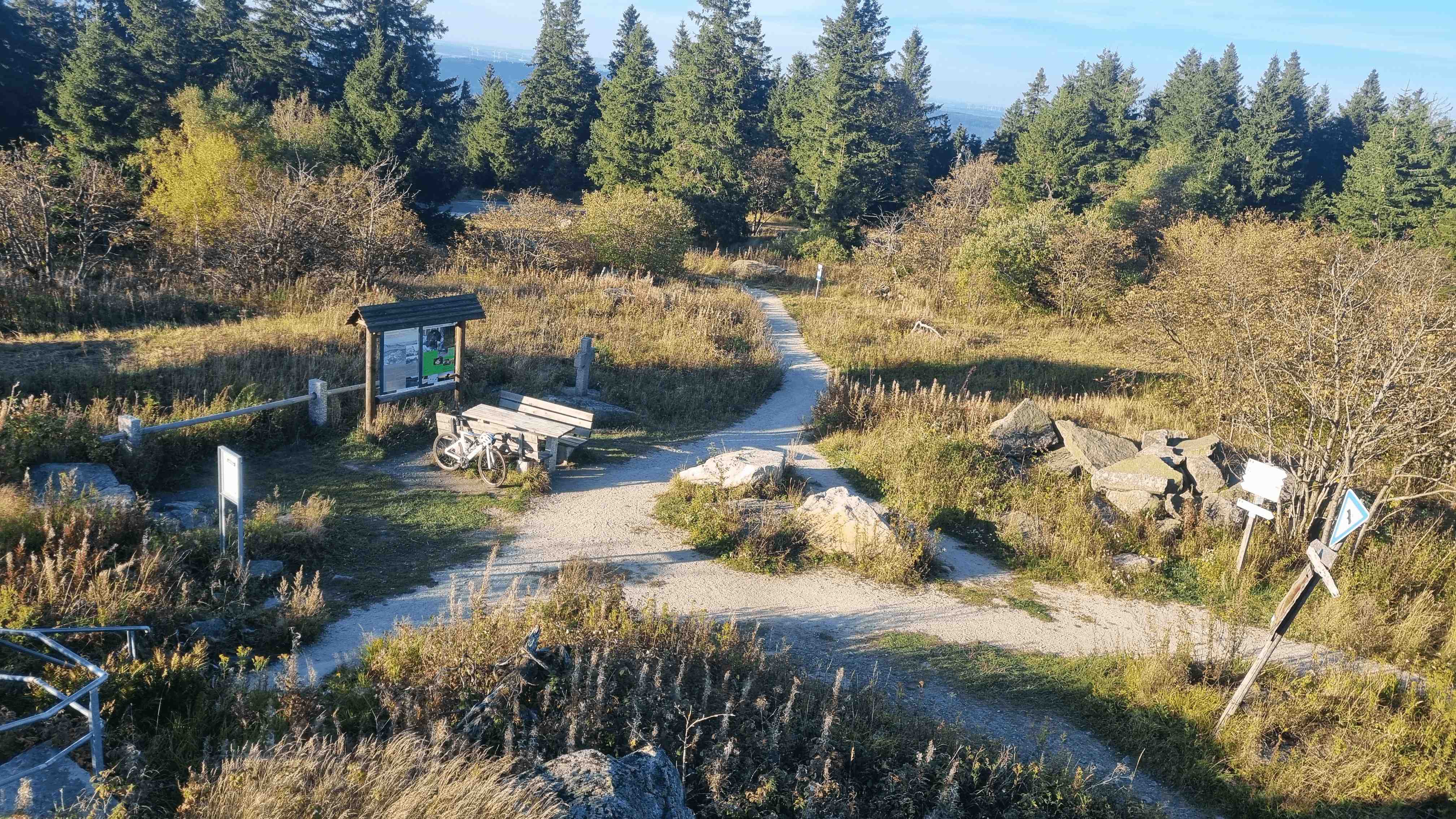 Bevor es in Richtung Schneeberg ging, machten wir nochmal einen Stopp an einem kleinen Supermarkt, der etwas versteckt lag. Stefan fehlte komplett die Motivation und er wollte diesen Anstieg nicht mitnehmen und auf uns unten warten. So trennten wir uns am vermeintlichen Abzweig und fuhren erstmal zu dritt weiter. Ich setzte mich aber sehr schnell von den beiden ab, da ich an diesem Berg doch nochmal meine Leistung testen wollte. Das erste Stück war steiler als erwartet, dann ging es in einer Kurve auf die eigentliche Auffahrt. Die Straße selbst war sehr gut und dazu für Autofahrer gesperrt, sodass ich ganz allein auf weiter Flur den Berg hoch eilte. Oben gab es einen Aussichtstur den ich erkletterte und einen großartigen Blick über das Fichtelgebirge hatte. Etwas später kamen Fayek und Skobi gemeinsam an. Bei der Auffahrt war mir klar geworden, dass die Strecke nicht bei Stefan wieder vorbeiführen würde. Wir drei hatten auch wenig Lust den ersten Teil des Anstiegs erneut zu fahren. So rief ich Stefan an und bat ihn schon mal loszufahren. Ich würde dann an einer Kurve auf ihn warten. Fayek und Skobi kamen dann auch bald und Stefan gesellte sich auch wieder zu uns. Die Pause hatte ihm sichtlich gutgetan und er fühlte sich wieder deutlich besser. Jetzt stand nur noch ein Berg an. Leider hatte ich bei diesem einen Fehler in meiner Streckenplanung gemacht und den letzten Abzweig zum Gipfel nicht richtig eingeplant. SO fuhren wir zwar fast bis nach oben, aber eben nur fast. Dadurch fehlte uns in der Schlussabrechnung bei quäldich leider dieser Berg und wir haben das Abzeichen nicht bekommen.