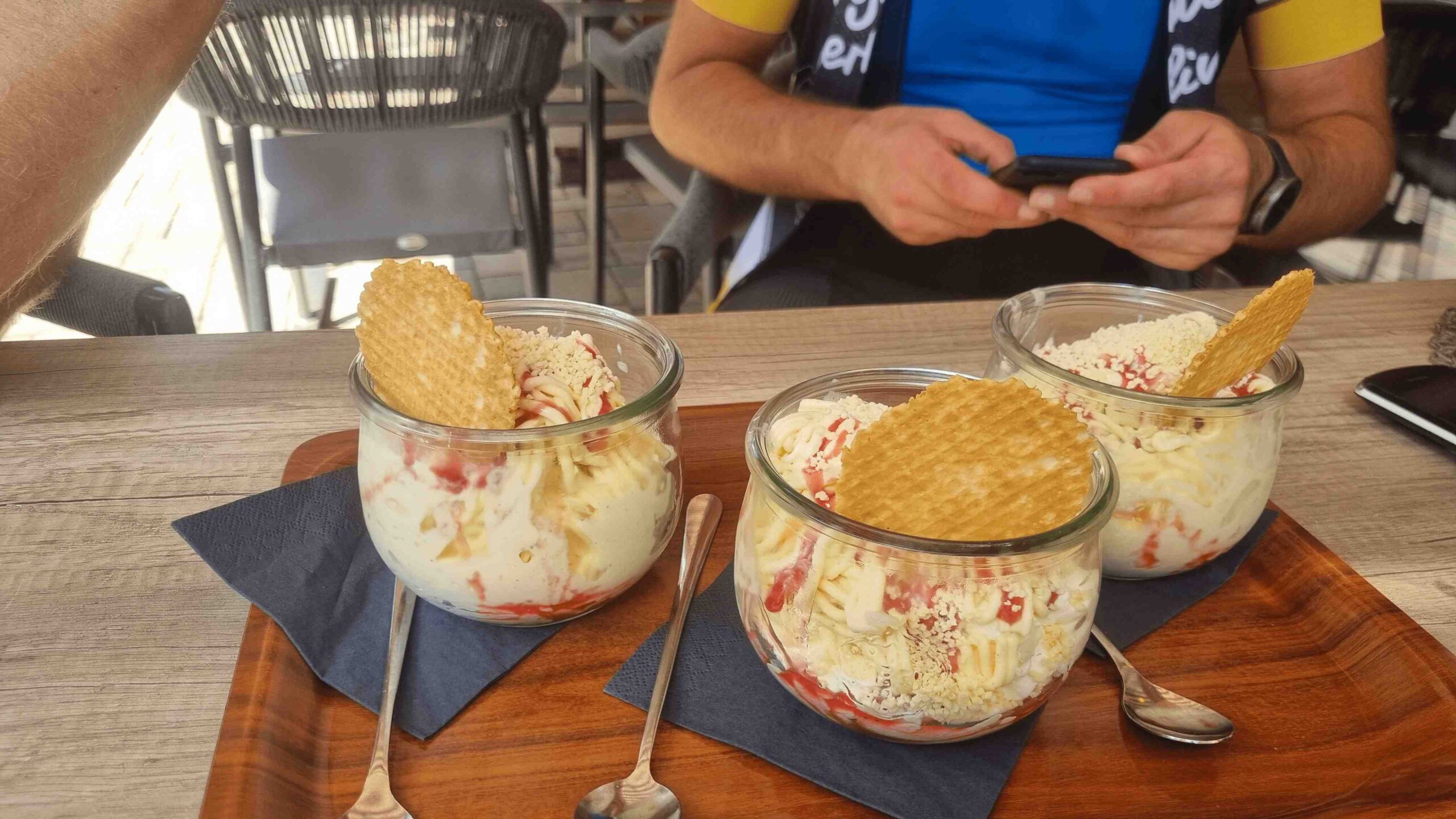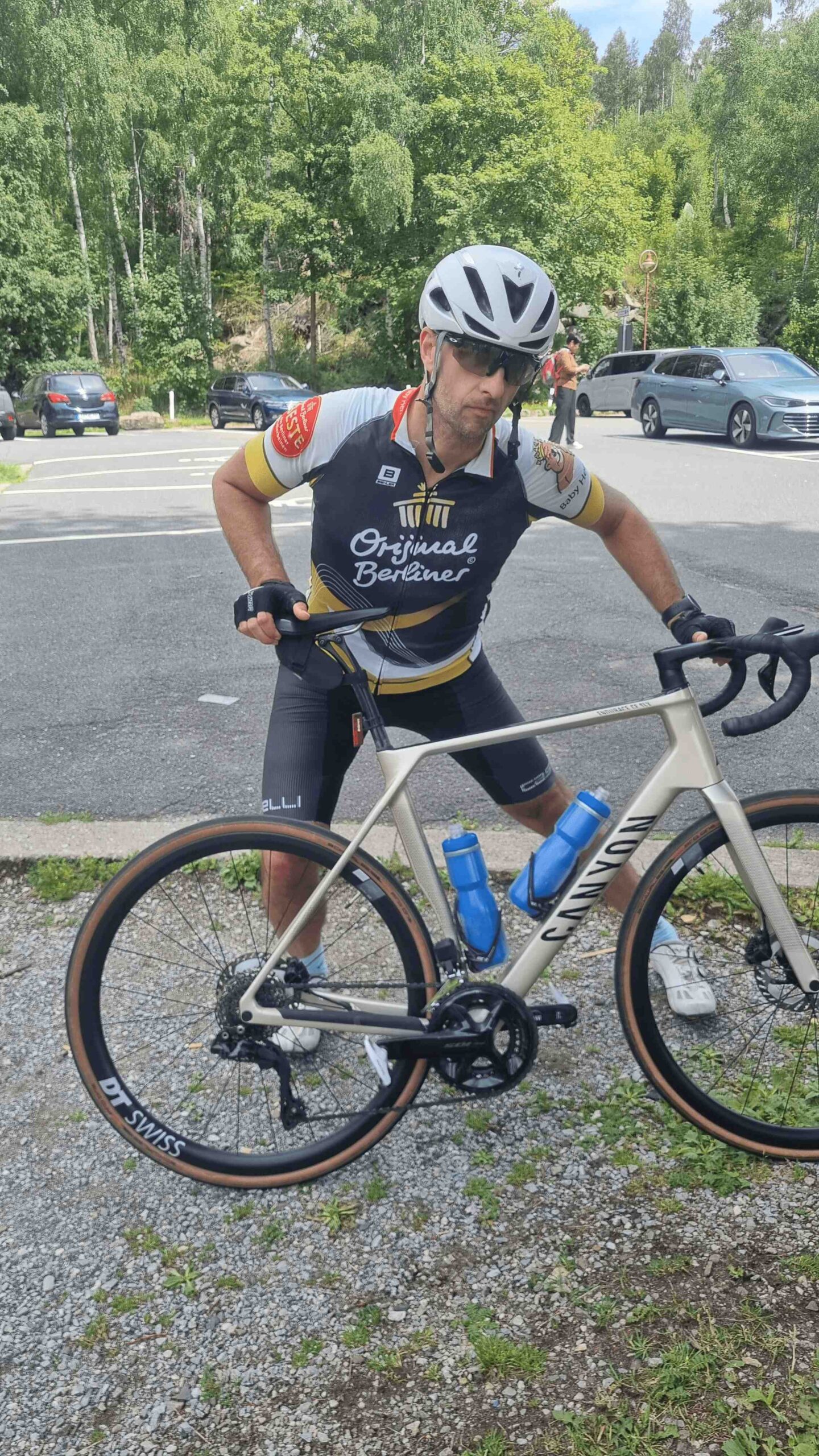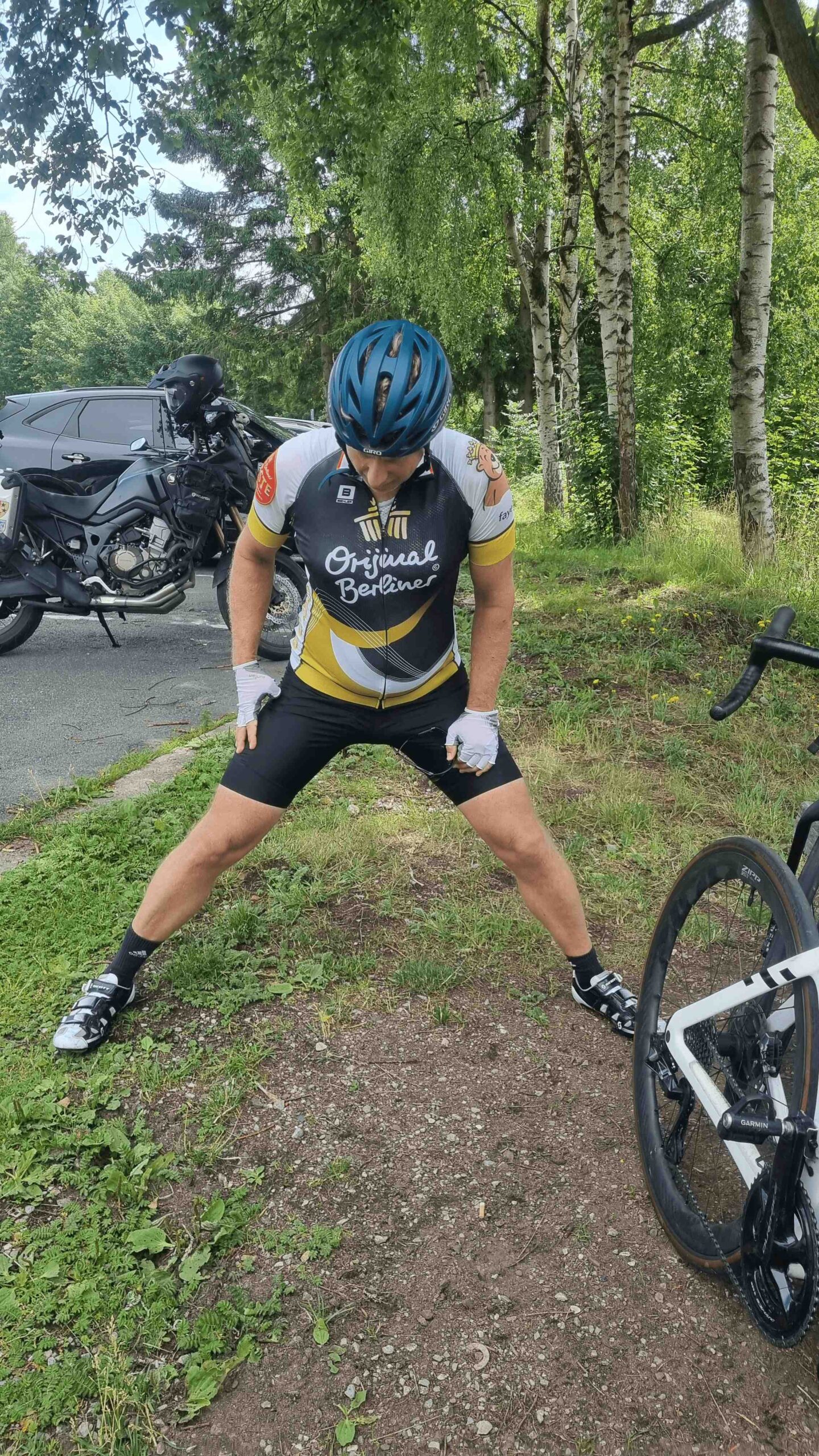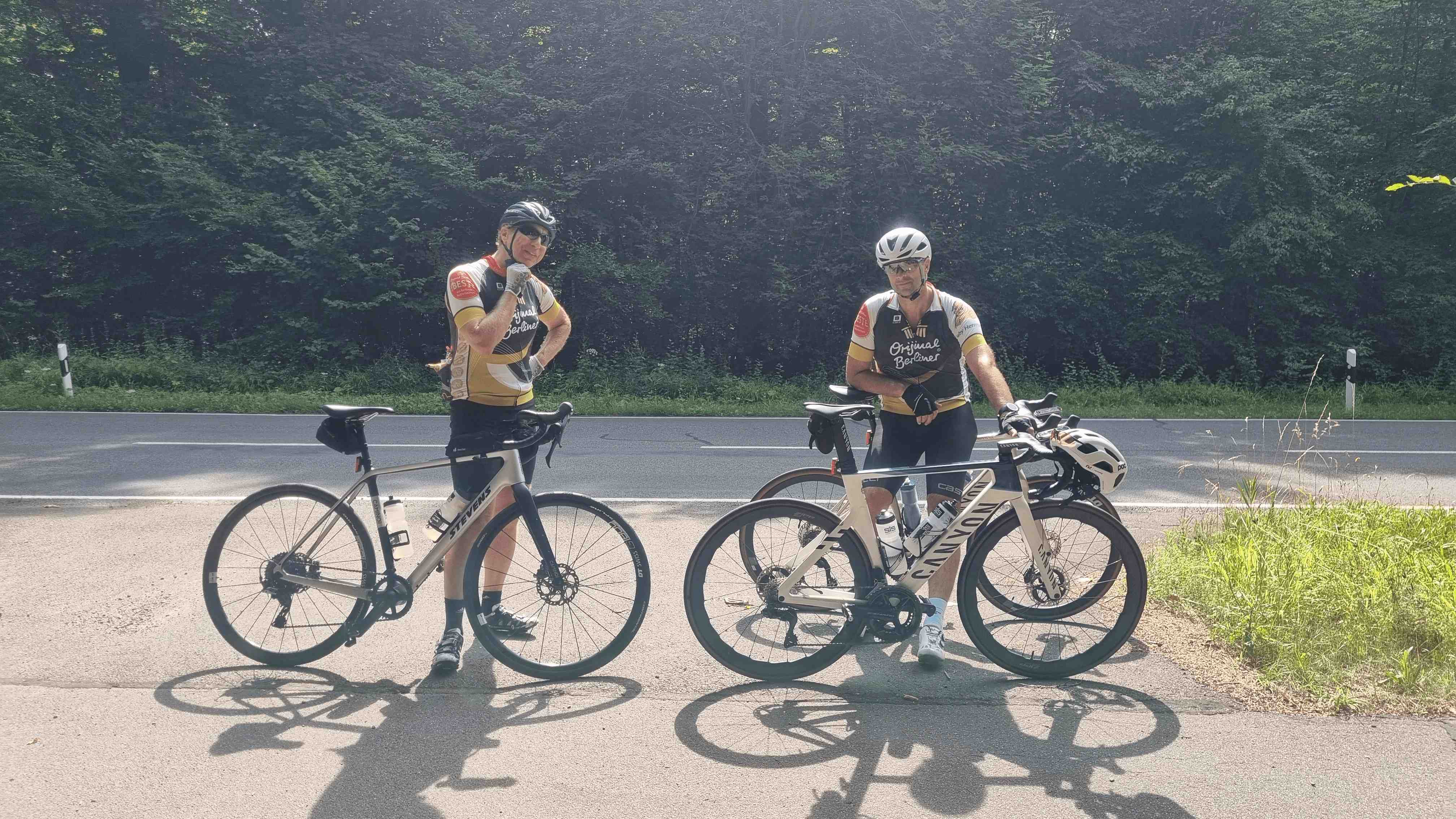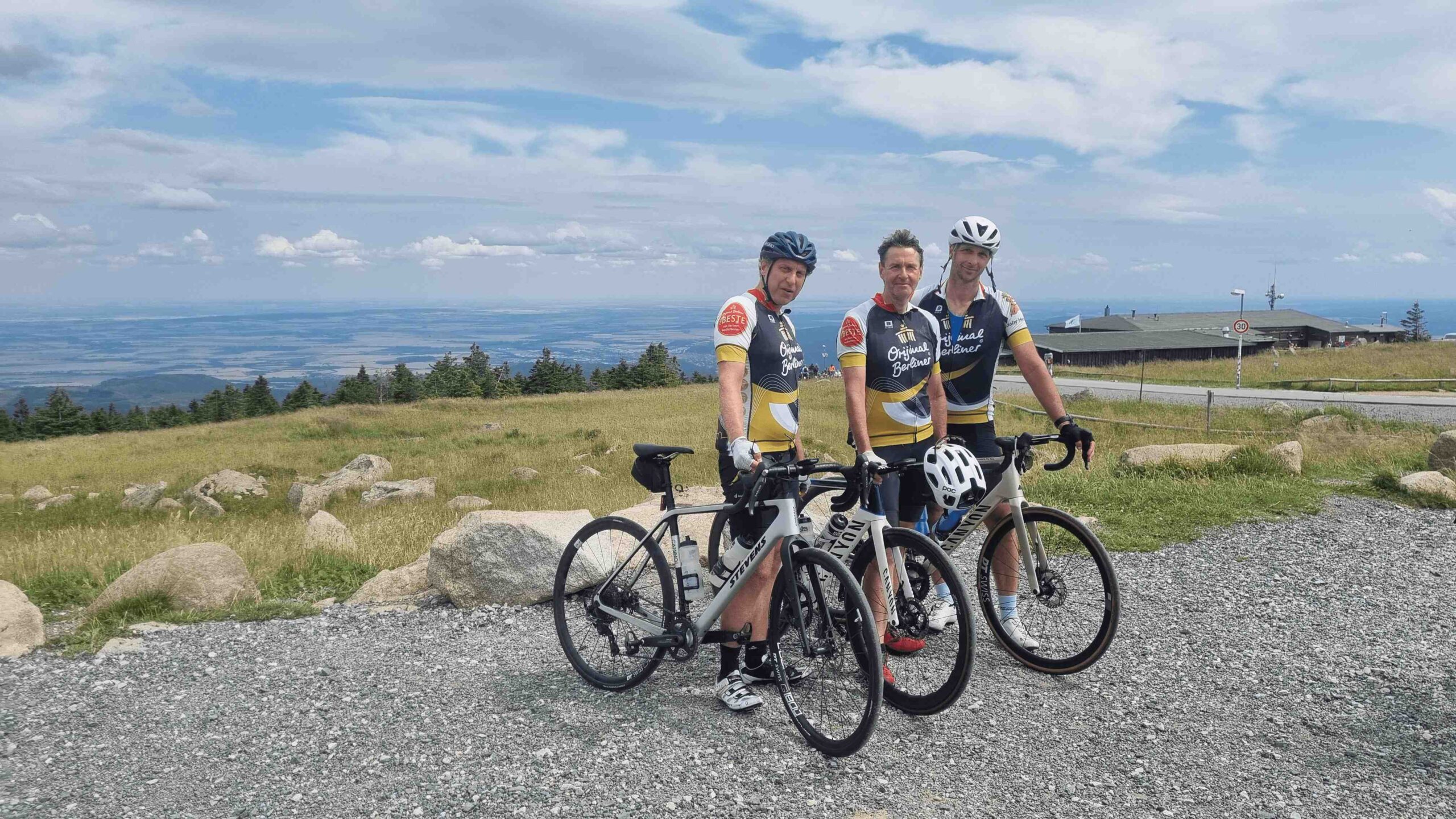 Stefan und Fayek fuhren fast den gesamten Anstieg zusammen, nur zum Schluss setze sich Stefan nochmal ab. Oben wurden wir noch von einem Radler angesprochen, den Stefan und ich überholt hatten. Er fing gleich zu quatschen an, als ob wir uns bereits seit langem kennen würden. Ich empfand es fast schon als etwas übergriffig. Er wollte einen von uns gleich für einen Triathlon engagieren, doch wir lehnten dankend ab. Es folgten natürlich noch die obligatorischen Beweisfotos. Stefan war im Nachgang etwas angefressen, da er wohl gut hoch gefahren war, ab die Segmentzeit erst genommen wurde, als wir die Zielfotos machten.
