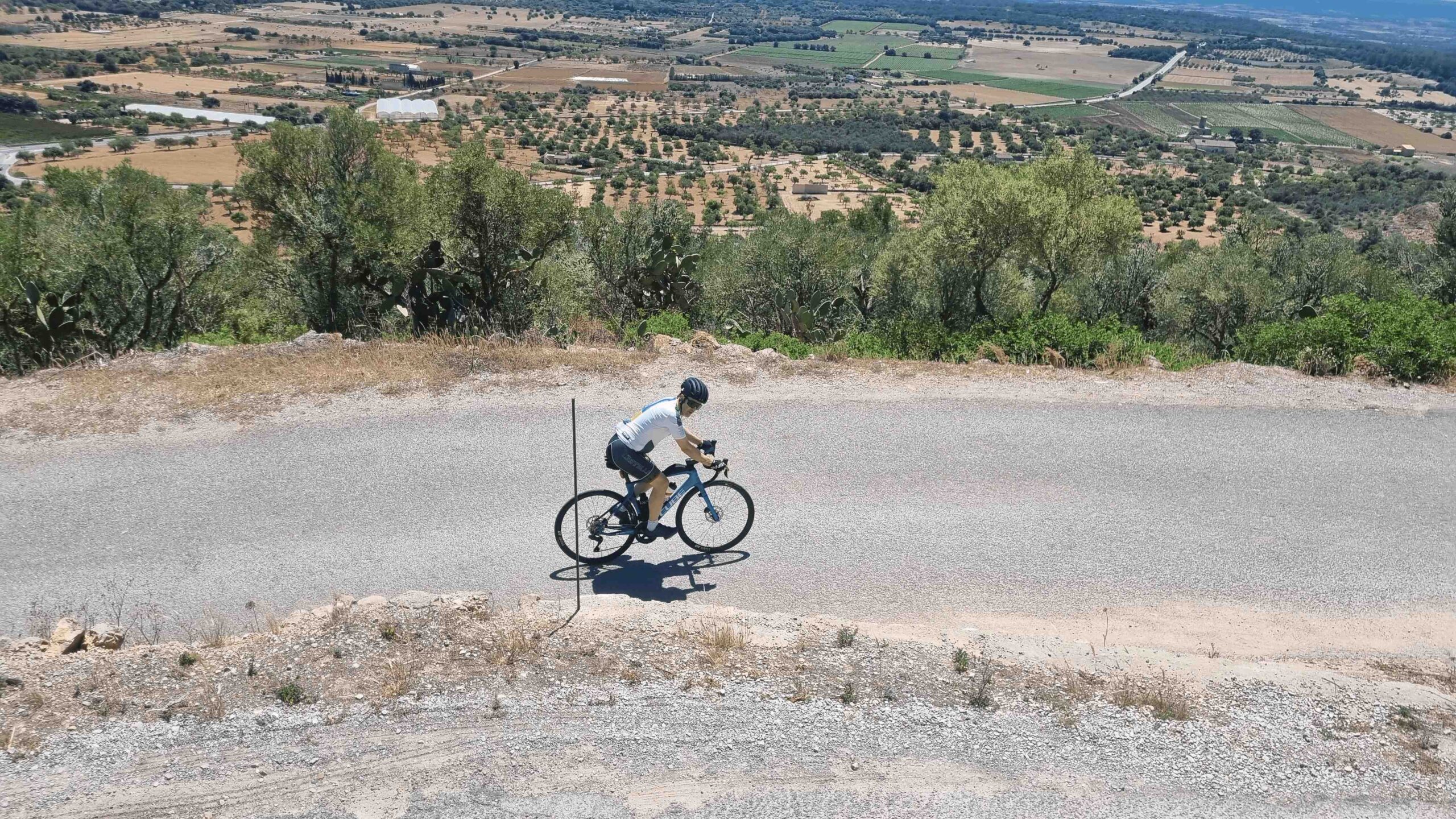 Für heute stand eine Runde fast quer über die Insel an, auf der wir mehrere Klöster als Anstiege ansteuern wollten. Frank war am Abend davor noch unsicher, ob er die gesamte Tour mit allen anstiegen mitfahren wollte, doch konnten wir ihn überreden es jeweils operativ zu entscheiden. So ging es von Port Alcudia wie am dritten Tag wieder Richtung Petra. Dort stand auch der erste Anstieg zur Ermity de Bonany an. Der Anstieg war zwar nicht der längste der drei, dafür aber der Steilste. Da es der Erste war entschloss sich Frank diesen ebenfalls zu fahren. Der erste Abschnitt war ein bißchen unschön, da wir uns die Straße mit der Anfahrt zu einem Steinbruch teilten und somit viele LKWs unterwegs waren. Sobald wir aber dann abzweigten, wurde es deutlich ruhiger. An jeder Kurve stand eine Statue mit einem Heiligenbild. Die Straße schlängelte sich schön unter Bäumen nach oben, trotz allem war es doch recht warm. Die 2 Kilometer waren recht schnell überwunden und oben genoss ich erneut den freien Blick über die Insel. Es gab dort auch die Möglichkeit frisches Wasser in die Flaschen u füllen, wovon wir direkt Gebrauch machten. Dieses Wasser schien auch direkt aus einem Brunnen zu kommen, da es nicht gechlort war, wie das Trinkwasser im Hotel.